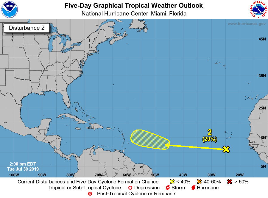 De enige andere disturbance op de Atlantische Oceaan ligt ten Westen van Afrika en heeft een vormingskans van 20% gedurende de komende 5 dagen. En ook al is de vormingskans dus laag binnen 120 uur, ontstaat de storm op de LT in vrijwel elk model en zou ik de uiteindelijke vormingskans dus persoonlijk rond de 70% zetten. Bij de meeste modellen komt de storm rond 7 augustus aan bij Puerto Rico, waarna hij naar het Noordwesten beweegt en op het einde wegkrult van de VS. Met een kerndruk van rond de 985 - 995 hPa zal de disturbance volgens de modellen niet sterker worden dan een tropische storm. Zoals het er nu uitziet zal de storm nog niet krachtig genoeg zijn boven Puerto Rico om gevaar te veroorzaken en komt hij niet dichtbij genoeg bij de VS voor echte problemen. Dus voorlopig is alles goed, maar het is wel iets om in de gaten te houden.