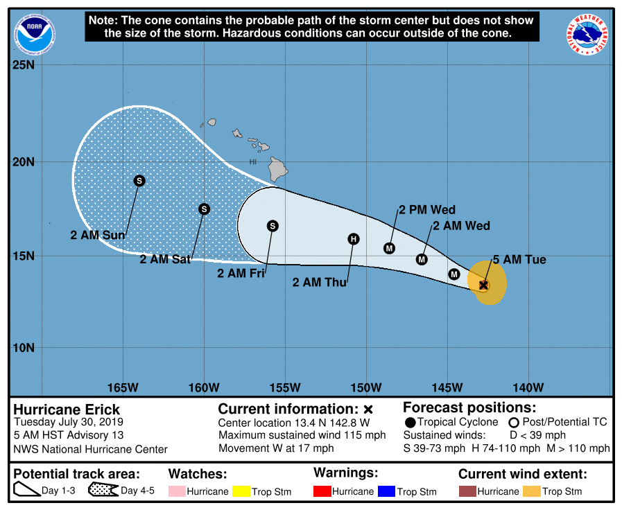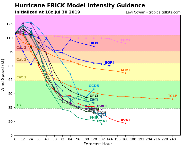 Op de Pacifische Oceaan bevindt zich momenteel een major hurricane, genaamd Erick. Zoals hieronder (2e afbeelding) is te zien, wordt verwacht dat de orkaan nog aansterkt naar een categorie 4. Vervolgens begint langzaam het uiteenvallen van de orkaan, maar mogelijk niet voordat Hawaii er problemen van krijgt. Bij zowel ECMWF, ICON, GFS en CMC blijft de storm ten Zuiden van de eilanden, maar kunnen de buitenste banden het eiland wel bereiken. Orkaankracht wind zal Hawaii dan niet bereiken, maar windsnelheden tot 60 km/h en tot 160 mm neerslag (ECMWF) zijn niet uitgesloten. Hawaii zal over zo'n 80 uur bereikt worden op vrijdag. Zoals te zien is in het intensity kaartje zijn de meeste modellen dan al in het tropische storm gebied, ook al is een sterke storm (cat 1 - 3) niet uitgesloten. Echter, deze modellen laten de orkaan verder ten Zuiden gaan, waardoor Hawaii er minder last van heeft. Ik denk dat Hawaii door Erick ten minste gespaard zal blijven, maar ik durf er geen zekerheid over te geven.