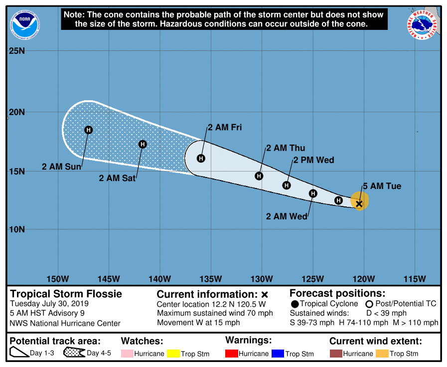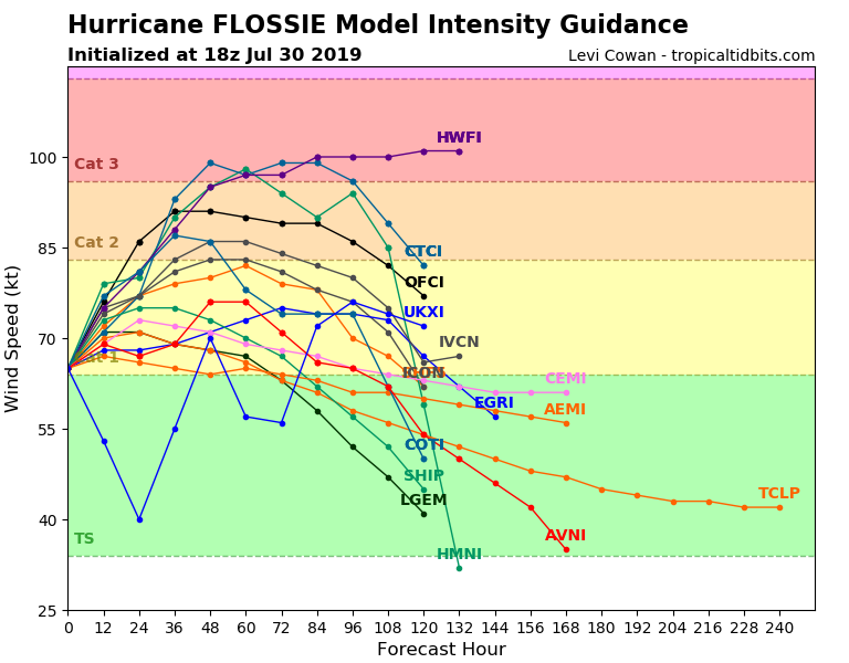 Flossie is op dit moment minder krachtig dan Erick, maar is denk ik een grotere bedreiging voor Hawaii. Terwijl ik dit schrijf is Flossie officieel een orkaan geworden. De meeste modellen zeggen dat Flossie aansterkt tot maximaal categorie 2, een enkel model gaat voor een cat 3 storm. Zowel EC als GFS laten de storm recht over Hawaii trekken rond +160 uur, als een verzwakte tropische storm. Dit kan echter nog steeds windsnelheden tot zo'n 80 km/h veroorzaken en opnieuw regen veroorzaken. Echter, HWRF en HMON, de 2 meest gebruikte orkaanspecifieke modellen, zijn een stuk heftiger. Bij HWRF wordt Flossie op +120 uur een categorie 4 orkaan, op het moment dat de storm bij EC en GFS al een tropische storm is. En ook HMON laat op dit tijdstip nog een categorie 2 orkaan zien. Ik denk dat er een redelijke kans is dat Flossie als zware tropische storm of categorie 1 orkaan over Hawaii heen trekt en het is dus zeker een systeem om in de gaten te houden. De cloudtop temperatuur van Flossie is momenteel extreem laag voor een categorie 1 orkaan, namelijk -75.05C. De daalsnelheid van deze waarde is gemiddeld over de afgelopen 3 uur ruim -4 C/uur. Dat kan een teken zijn van zeer snelle intensivering en doet me denken aan orkaan Michael vorig jaar.