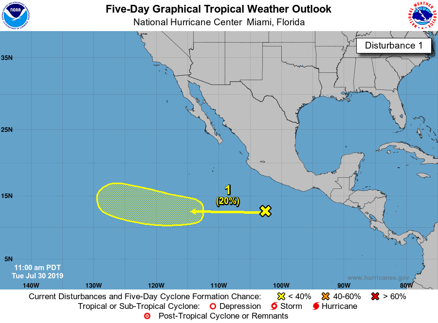 Er is één disturbance in deze regio met een vormingskans van 20% gedurende de komende 5 dagen. Geen van de modellen heeft er echter zin in, alleen JMA en NAVGEM laten een zwakke tropische storm zien (1000 - 1005 hPa) die naar het Noordwesten beweegt. Voorlopig kunnen we stellen dat deze disturbance onwaarschijnlijk is en zelfs bij vorming weinig gevaar vormt.