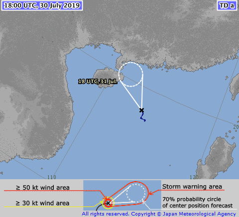 Deze disturbance ligt ten Zuiden van China en zal China waarschijnlijk morgen bereiken als een tropische storm met een kerndruk van 992 hPa en windsnelheden tot 65 km/h en windstoten tot 90 km/h. Bij EC trekt de storm vervolgens naar het Westen om later als een sterkere storm met een kerndruk van 985 hPa aan land te komen in Vietnam op vrijdag. ICON en NAVGEM gaan hierin mee, maar modellen zoals GFS en JMA houden de storm op het land, waardoor deze sterk afzwakt. De disturbance brengt heel veel regen met zich mee, lokaal kan er de komende 5 dagen 300 mm vallen volgens EC.