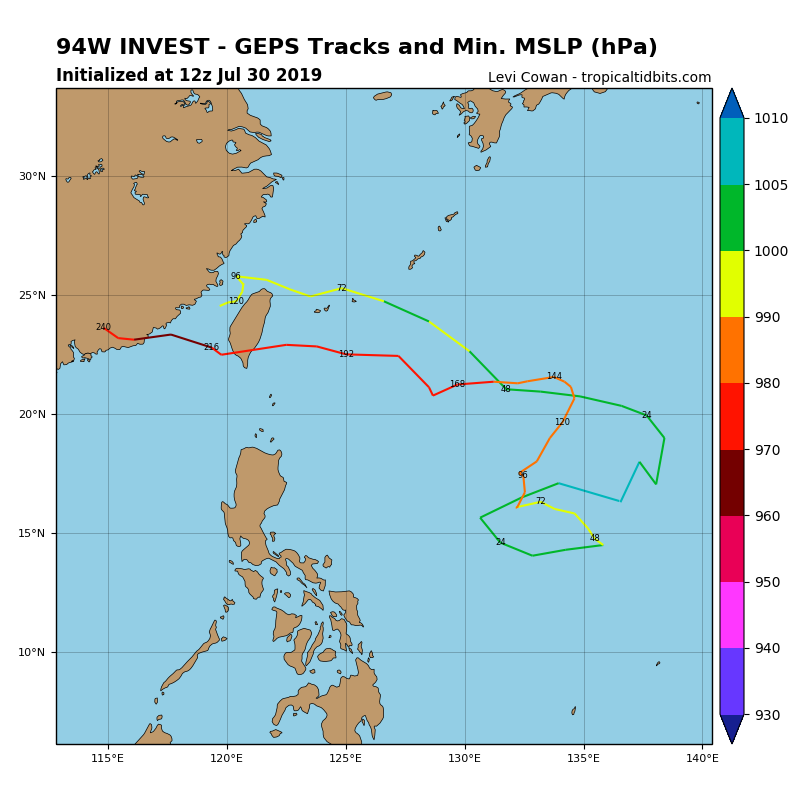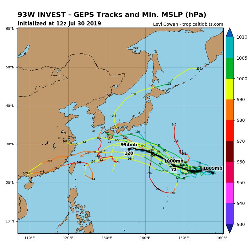 Daarnaast is er nog één officiële disturbance, 94W. En hoe het mogelijk is weet ik niet, maar deze is nog veel onzekerder dan disturbance 2. Even op een rijtje: EC laat een tropische storm richting Japan zien. CMC een cat 1 typhoon richting Zuid-Korea. NAVGEM laat niks zien, ICON een cat 1 typhoon richting Taiwan. En GFS laat een enorme typhoon zien met een kerndruk van 938 hPa die als zware typhoon (940 hPa) Japan raakt, maar wel pas op 12 augustus. En andere versies van CMC/GEPS hieronder gaan dan weer richting Taiwan. Het komt zelden voor dat de modellen zo verspreid zitten, dus voorlopig is het nog afwachten.