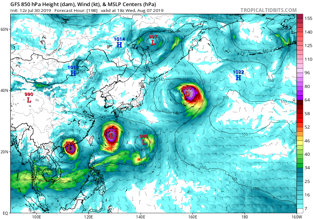 Jawel, een Weerwoord disturbance, want de modellen laten nog één nare storm zien op de LT waar de het Japanse typhoon centrum voorlopig nog niks over zegt. Het gaat dan om een stormsysteem ten Westen van de Filipijnen dat richting China trekt, dat zich past echt begint te vormen op +100 uur. Voor normaal weer is dat echt de LT, maar voor orkaanverwachtingen is het nog binnen de marge om er serieus naar te kijken. Het is GFS dat er alleen voor staat en dat komt met een zware typhoon richting Zuid-China. In tegenstelling tot het weer in Europa, zit GFS naar mijn ervaring vaak redelijk goed qua orkanen en voorspellen ze stormen soms eerder dan alle andere modellen. Daarom is dit toch noemenswaardig. Op de afbeelding hieronder is de meest linkse storm onze disturbance. De middelste storm is overigens disturbance 3 en de rechter storm is disturbance 2. Met een kerndruk van 928 hPa en windsnelheden tot boven de 200 km/h kan dit een zeer gevaarlijke typhoon worden. Maar zoals ik al zei, heeft het Japanse weercentrum er niet zonder reden nog niks over gezegd. Voorlopig is het alleen GFS dat de storm aangeeft en is het nog wachten op een mogelijke reactie van de andere modellen.