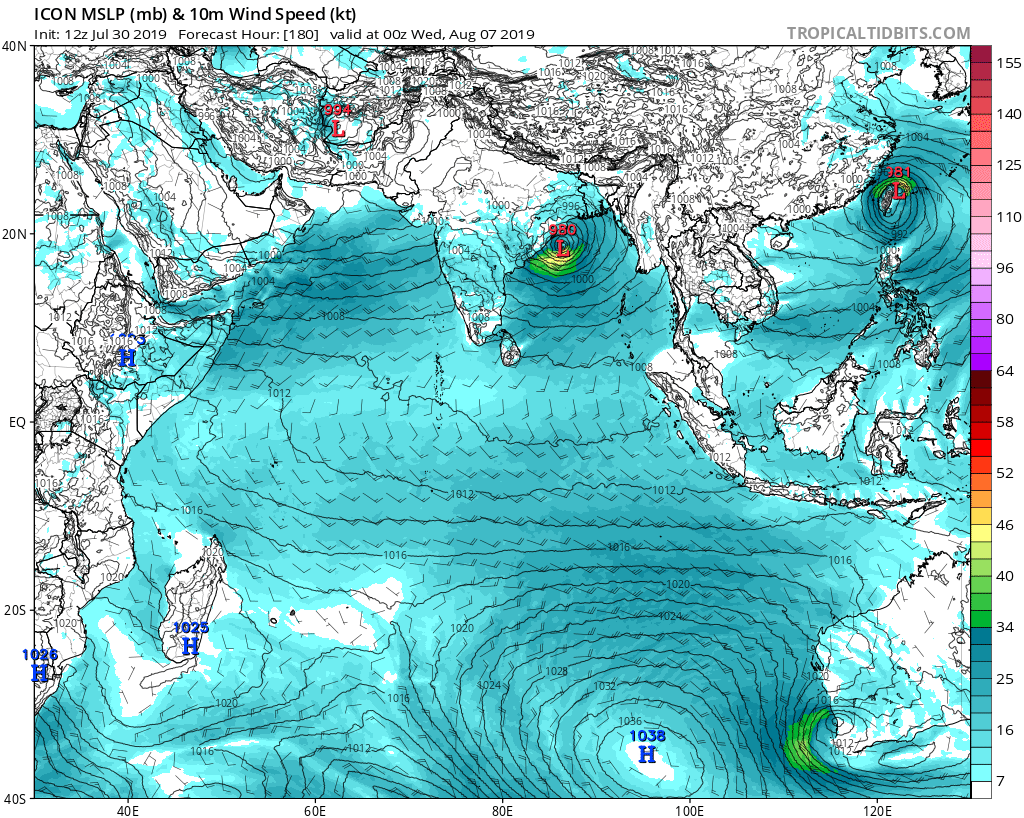 Zowel EC als ICON wijzen op een storm die ten Oosten van India kan ontstaan rond +100 uur en volgende week India kan raken als een tropische storm. De andere modellen houden het meer op een tropische golf met onweersbuien. Hoe dan ook kan de disturbance voor extreem veel regen zorgen in de regio. ECMWF komt lokaal zelfs met 800 mm de komende 10 dagen en op grote schaal meer dan 300 mm. GFS is minder scheutig, maar komt tot 200 mm de komende 10 dagen. Bij GFS blijft de 600+ mm bel boven de Oceaan.