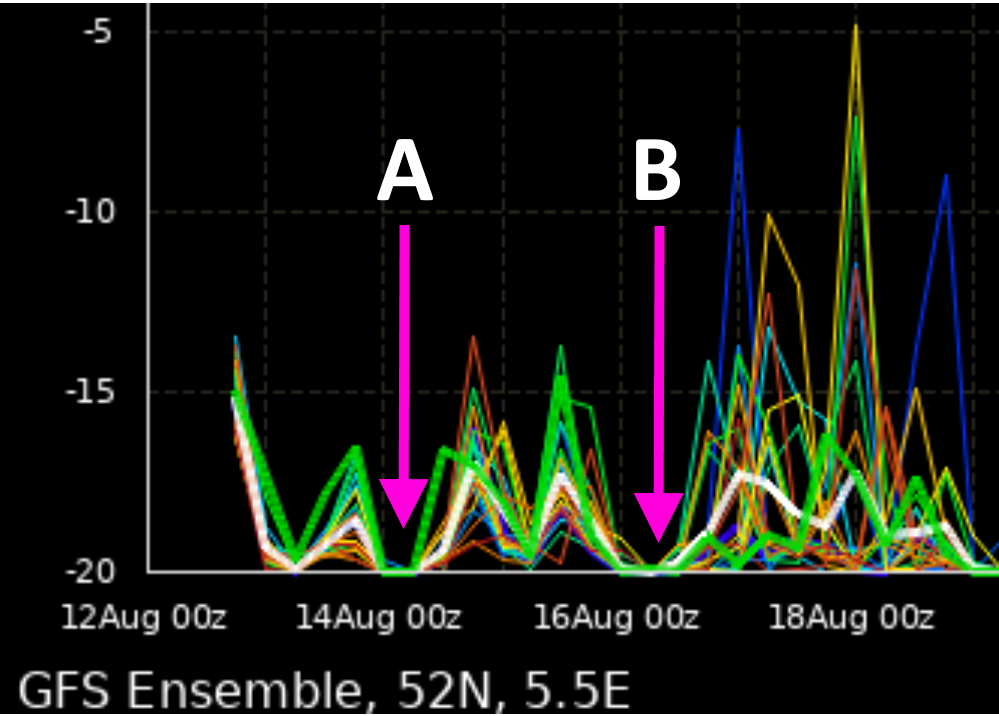Zowel in de ochtend van woensdag de 14e (A) als op vrijdag de 16e (B) zien we duidelijke neerslagdalletjes in het GFS-ensemble. Op beide momenten passeren tijdelijk hogedrukrugjes ons land waardoor neerslag wordt onderdrukt. Op woensdag volgt na de rug echter heel snel een frontaal systeem met in de avond alweer neerslag. Ook op vrijdag volgt alweer snel verstoring met in het weekend een duidelijke neerslagpiek!