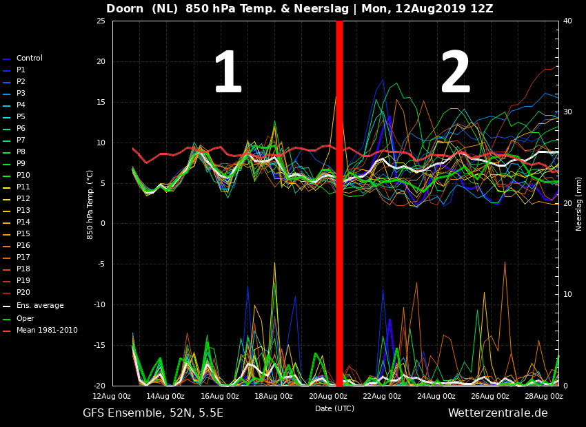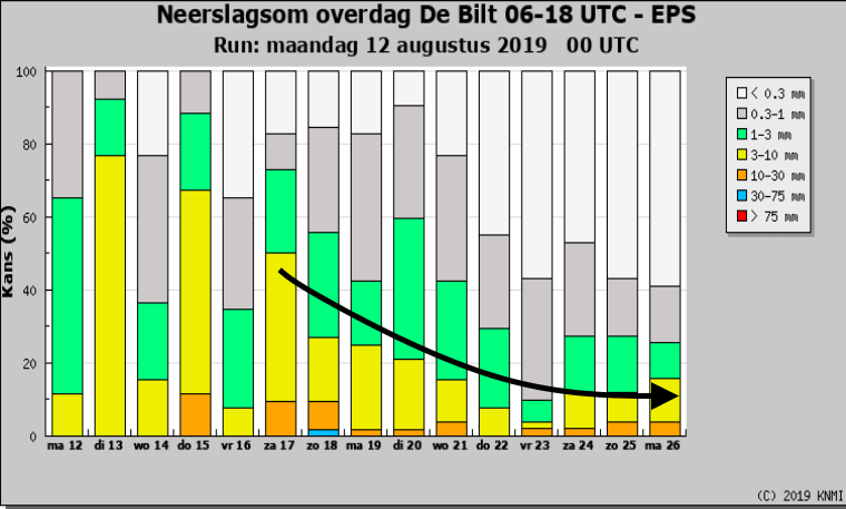 1) De huidige wisselvallige periode waarin genoeg neerslagkansen zijn. De gehele periode is de stroming westelijk tot zuidwestelijk met geregeld passage van gebieden met verhoogde onstabiliteit en regen of buien. Morgen passeert een grootschalige hoogtetrog ons land met dan buienkansen. Woensdag passeert later een warmtefront met enige regen, donderdag in onstabiele lucht buien. Vervolgens in het weekend opnieuw verhoogde neerslagkansen onder invloed van een laag boven de UK. Zaterdag passage frontale zone met regen, zondag en maandag koude bovenluchten (T500 = -22) met dan forse kustbuien, zondag mogelijk deels onderdrukt door passage van een rug. Cumulatief over deze periode (12-20 augustus) de hoogste neerslagsommen in de noordwestelijke helft van Nederland. Het warme zeewater (19-20 graden) kan flinke buien triggeren. Temperaturen deze periode onder normaal