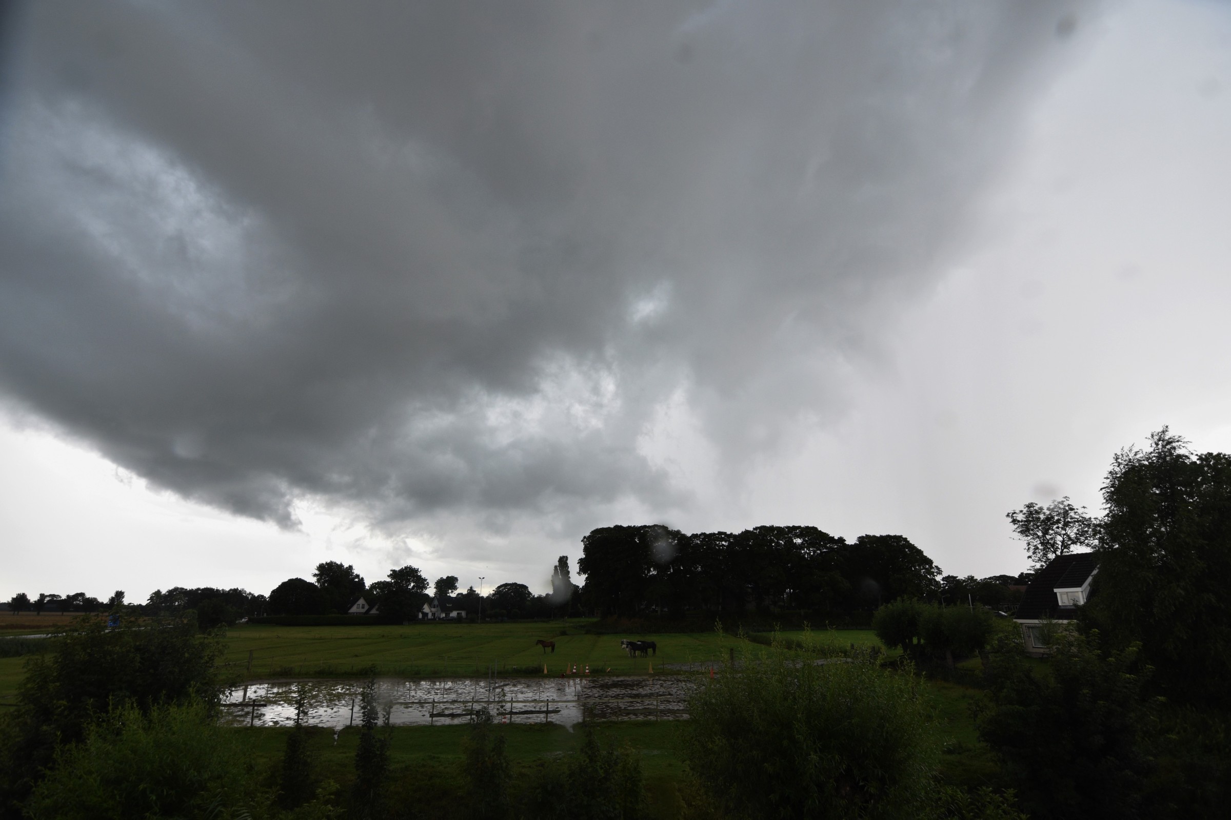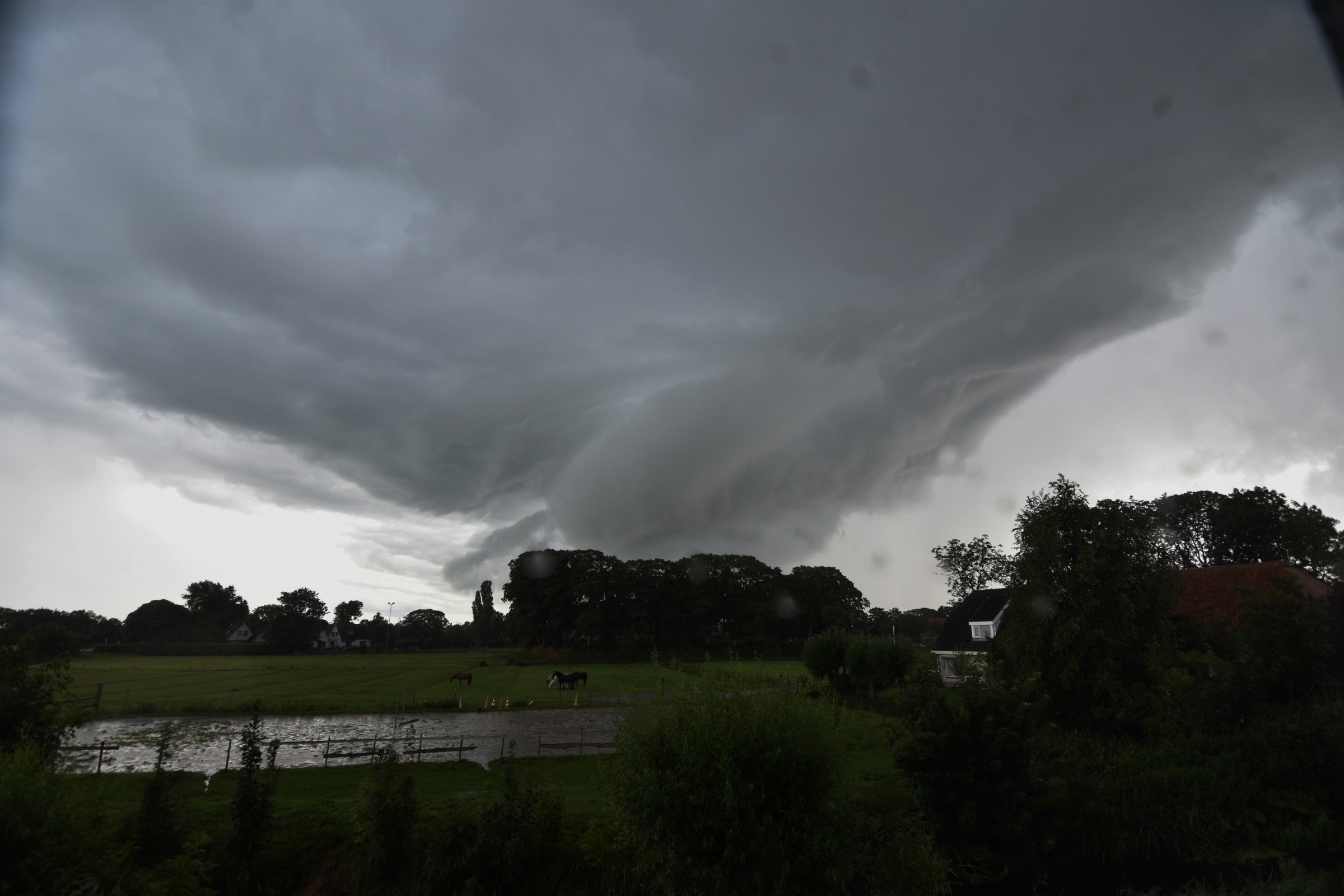 Zat aan de zuidoost flank van de onweersbui. Proces duurde een minuut of 7, tijdens overtrekken ging de wolk snel over in een rolwolk (laatste foto). Er volgde onweer en regen.