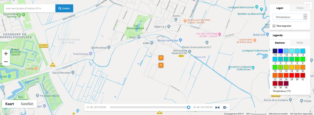 Windmeting van De Bilt is op 20 meter i.v.m. begroeiing in de omgeving