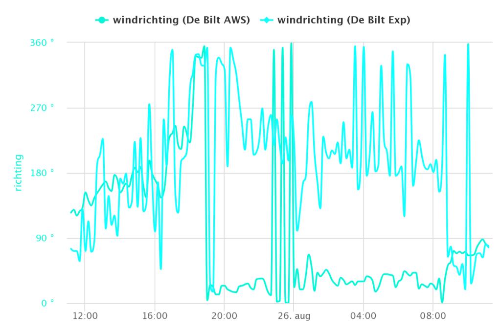 Windmeting van De Bilt is op 20 meter i.v.m. begroeiing in de omgeving
