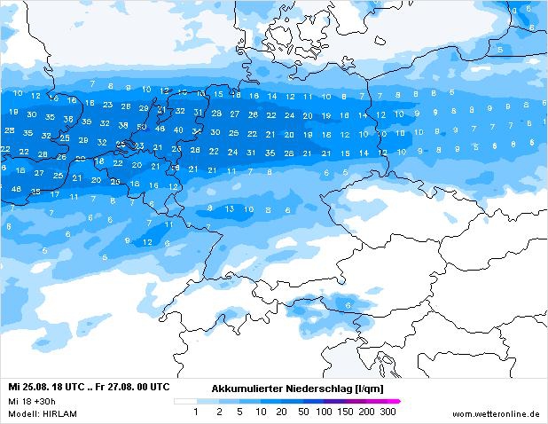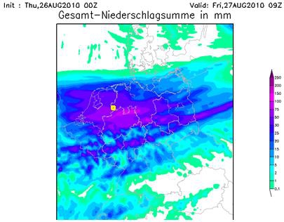 Deze twee modellen waren zeer verschillend in het berekenen van de verwachte neerslag van (HIRLAM 25,26,27 Aug) en (GFS 26,27 Aug). Hirlam kwam met gemiddeld 40 mm terwijl GFS met waarden tussen de 50 en 75 mm kwam. Hieronder zijn de beide modellen weer gegeven met de verwachte neerslag. Wat duidelijk was, was dat er genoeg potentie was dat er veel neerslag zou vallen. Maar hoeveel was nog onduidelijk.
