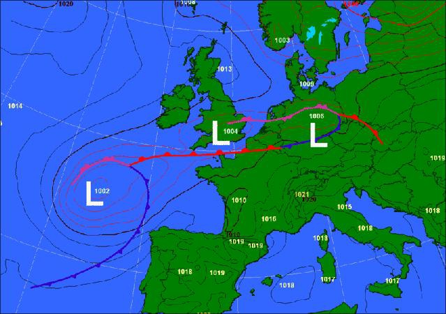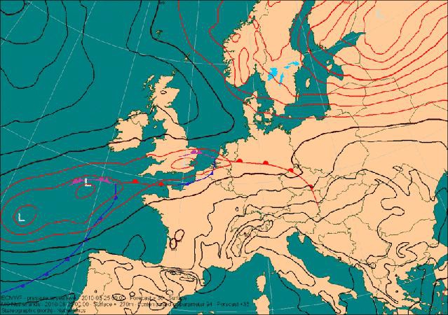 Dit zijn de algemene luchtdruk kaarten met de bijbehorende fronten die ons land aan gaan doen.