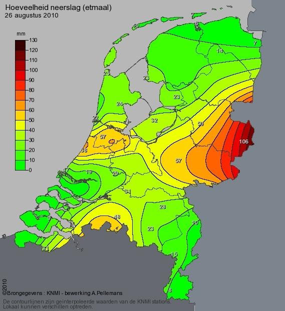 Een willekeurige plaats in ons land krijgt gemiddeld vijf keer per jaar een hoeveelheid van minstens 20 en 24 mm binnen een etmaal; een etmaalsom van minstens 26 tot 32 mm komt ongeveer twee keer per jaar voor en eens per tien jaar valt er minstens 50 tot 62 mm op een dag. Een etmaalsom van 138mm in Lievelde. De op twee na hoogste etmaalsom ooit gemeten in Nederland. De wateroverlast die toch wel op grote schaal aanwezig was, hebben we sinds 1998 niet meer gezien. Tot nu toe!