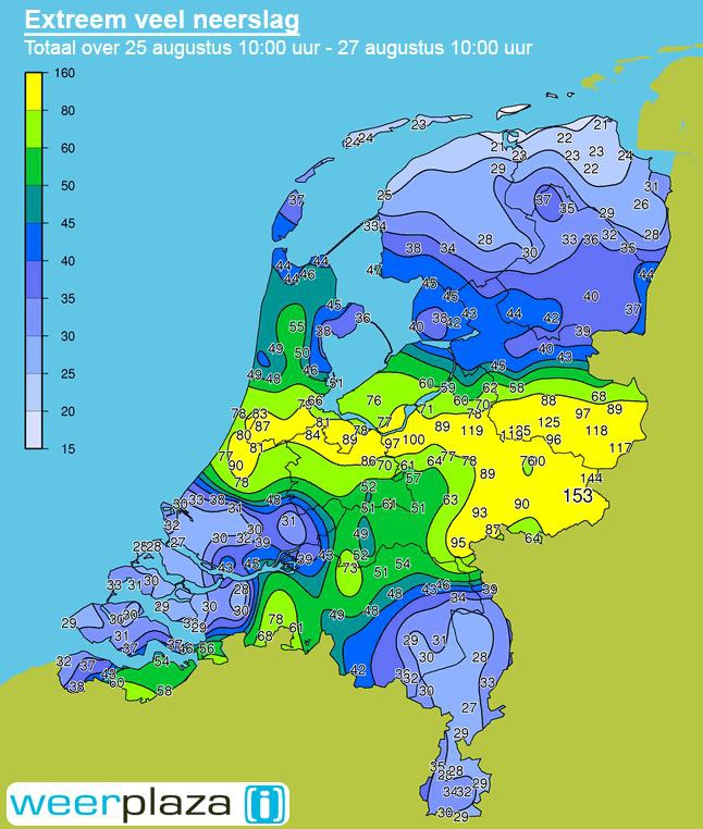 Normaal valt er in de hele maand augustus zo'n 60 mm. De maandsom is na de vele regen van de afgelopen weken al ruimschoots overtroffen. Gemiddeld over het land was tot vanochtend al 95 mm gevallen. Op veel plaatsen heeft augustus al 100 tot 150 mm opgeleverd en na de regen van vandaag staat de teller lokaal al op meer dan 200 mm.