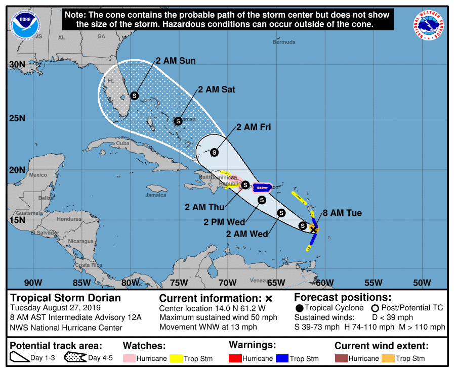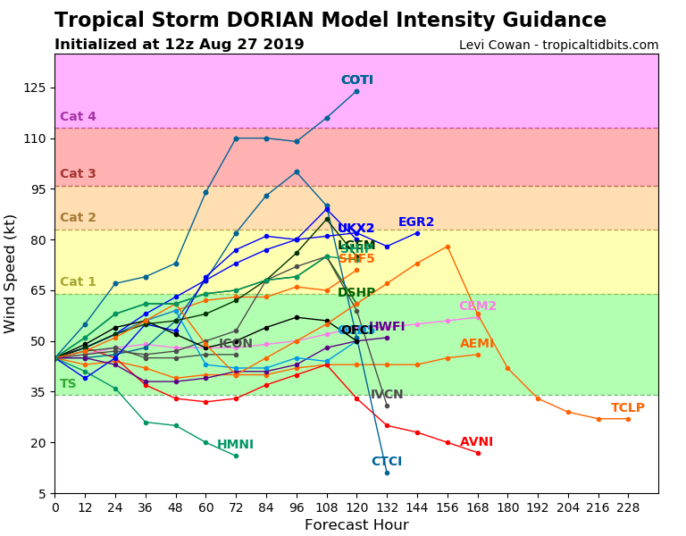 Op dit moment trekt de storm over de Bovenwindse eilanden als een tropische storm. Hierbij kan lokaal tot wel 200 mm regen vallen. Vervolgens zal Dorian over 1 à 2 dagen precies tussen de Dominicaanse Republiek en Puerto Rico gaan (ook als tropische storm), sommige modellen laten de storm wel over Puerto Rico gaan. Vaanwege de exacte locatie van het pad is de neerslaghoeveelheid in de regio nog onzeker, maar deze kan tussen de 70 - 130 mm liggen. Waarschijnlijk worden de bergen in de Dominicaanse Republiek gemist, waardoor Dorian niet veel afzwakt en vervolgens relatief vrij baan heeft richting de Bahama's en op de LT Florida. Over dat laatste is nog veel onzeker. NHC is zeer conservatief op dit moment (logisch gezien de termijn) met een tropische storm aankomst in Florida op zondag, maar zo'n 60% van de modellen op tropical tidbids (zie hieronder) gaan voor een categorie 1 landfall en de afgelopen 12 uur zijn sommige van de orkaan specifieke modellen iets extremer geworden. Hoewel nog onwaarschijnlijk op dit moment, zijn er modellen die voor een cat 3+ gaan bij landfall. In tegenstelling tot orkanen zoals Irma en Harvey is er geen duidelijk idee hoe krachtig deze storm kan worden. We kunnen kijken naar een tropische storm of misschien een major hurricane rond het weekend. En er zijn ook modellen die de storm tussen Cuba en Florida laten gaan, waardoor er nog meer tijd tot aansterking is en de golfprovincies van de VS in gevaar zijn (ook al is dit scenario wel in de kans afgenomen de afgelopen 12 uur). Hoe dan ook een systeem om op te letten, nu en in de toekomst. Als je nu in de Bovenwindse eilanden zit, kan je er niet veel meer aan doen. Maar aan inwoners en vakantiegangers in de Dominicaanse Republiek, Puerto Rico en Florida is het wel handig om in ieder geval de weersverwachting goed in de gaten te houden.