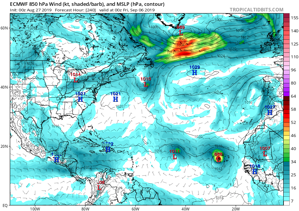 Voor de rest is de Atlantische Oceaan nu nog relatief rustig (maar ja, ik zou 2 stormen ook niet rustig noemen), maar daar kan op de LT verandering in komen. Vanaf +180 uur (4 september) is in bijna alle modellen een soort tropische golf te zien die vanaf West-Afrika de Atlantische Oceaan binnenkomt. Stormen nu accuraat intekenen op die termijn kan niet echt, maar EC laat bijvoorbeeld twee stormen ontstaan waarvan één in vormingswijze en richting akelig veel lijkt op de typische Cape-Verde orkanen zoals Allen en Irma. Hoe het allemaal uitpakt weet ik niet, maar het zou me niet verbazen als het Atlantische orkaanseizoen de 2e week van september een aantal niveau's wordt opgevoerd.