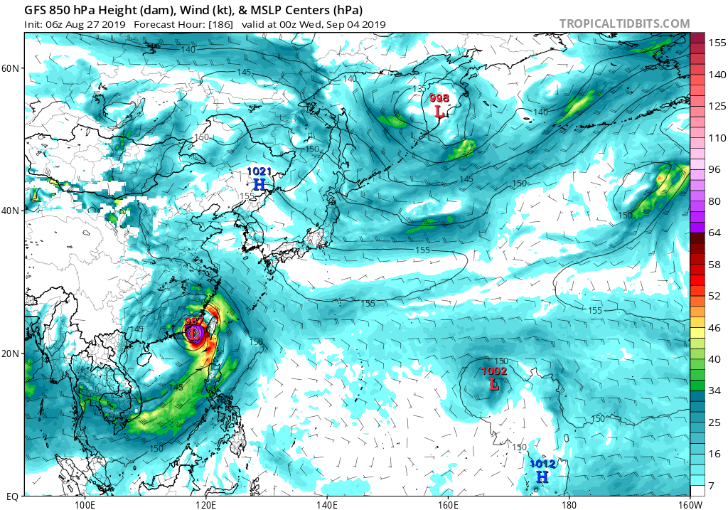 Zowel GFS als EC laten rond +96 uur een tropische storm ontstaan in de buurt van de Filipijnen die vervolgens als een typhoon over het eiland trekt en daarna, opnieuw als typhoon, aan land komt in China. De storm is een stuk krachtiger bij GFS dus het echte gevaar van de storm is nog onzeker, maar ook dit is een potentieel riskante situatie.