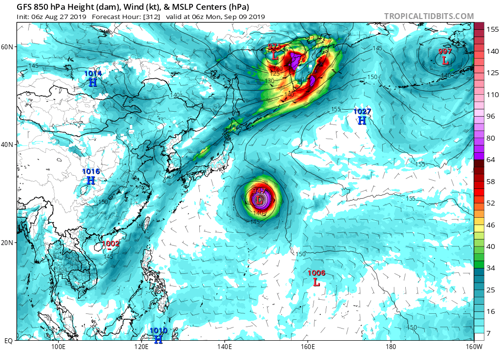 Nog iets verder in de run is er een duidelijke krachtige typhoon te zien bij GFS ie richting Japan gaat. De storm trekt naar het Noordoosten voordat Japan bereikt wordt, maar vanwege de termijn en de kracht van de typhoon, is dit nog alles behalve zeker. Echter, de vorming van de storm is nog ook lang niet zeker, aangezien EC niet echt meegaat in het scenario. Dus voorlopig is hier nog niet heel veel over te zeggen.