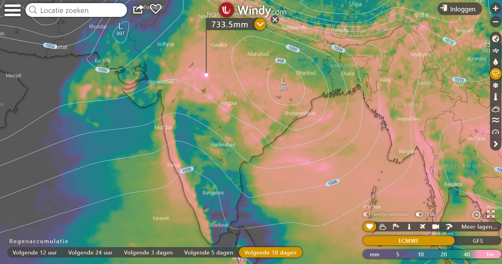 Er zal geen gebrek zijn aan regen in India de komende tijd met mogelijk 600+ mm in de bergen de komende 10 dagen, maar er is geen duidelijke indicatie van een tropische storm in de regio de komende tijd. Ook de Zuid-West Indische Oceaan is de komende periode zeer waarschijnlijk vrij van stormen.
