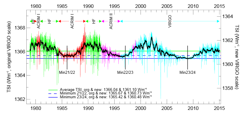 (De rechter y-as geeft de goede (nieuwe) waarden aan, vroeger werd de zonneconstante iets te hoog ingeschat.)