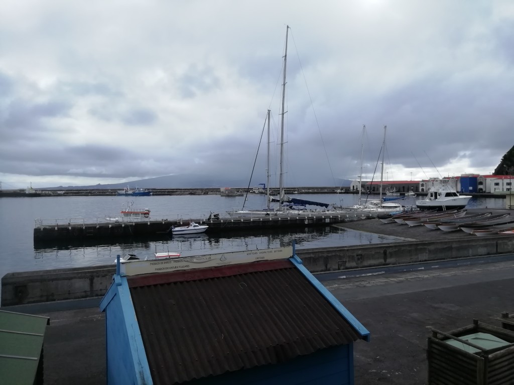 Dat betekent hier lang niet altijd mooi weer, het is hier immers niet voor niets super groen. Onderstaand uitzicht op het eiland Pico vanaf de stad Horta op het eiland Faial. Inmiddels is het grijs en regenachtig. Gisteren was overigens een stranddag onder een strakblauwe hemel, dat hadden we ook nog niet gehad tot gisteren