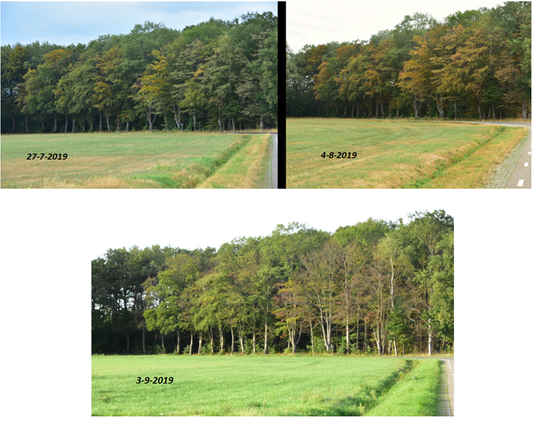 Het begon in juli. Toen sommige beukenlanen en berken chlorofyl gingen afbreken om zo snel mogelijk hun blad te laten verliezen om water te besparen en verdamping tegen te gaan. Bij veel bomen werden de bladeren geel en vielen daarna af. Hiervan is een groot aantal erin geslaagd om nieuwe knoppen te vormen door toch nog voldoende regenwater die soms viel ( augustus was vrij nat (80+mm). Wat wel vaststaat is dat deze bomen het komende jaar kleinere bladeren zullen hebben, en minder zal groeien dan andere jaren.