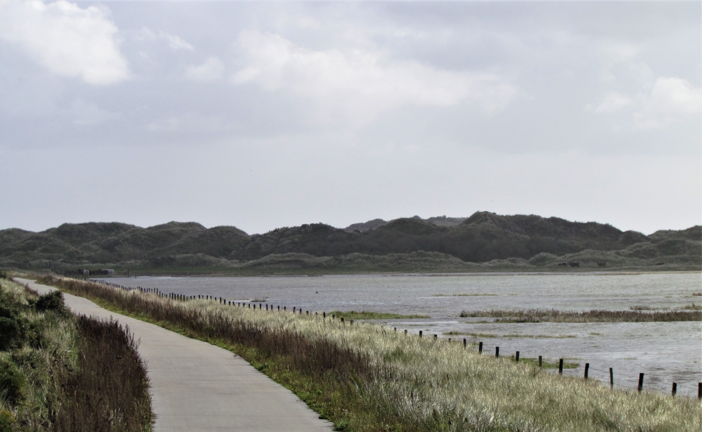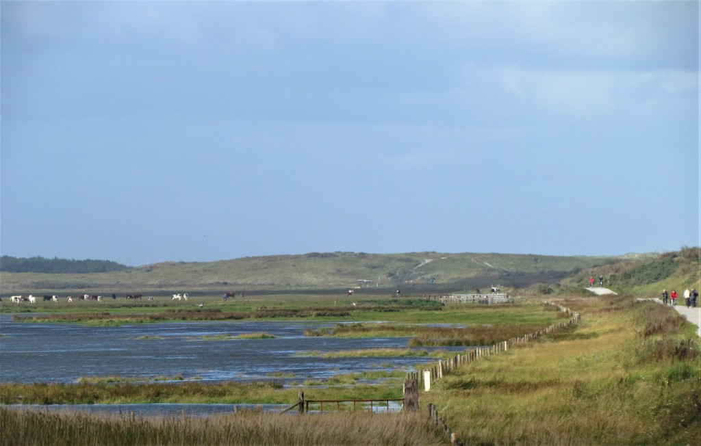 Overzicht vanaf paal 19, halverwege de kwelder, waar op de duinen in de verte de verweide schapen te zien zijn, met op de horizon bomen van de dorpskern van Buren.