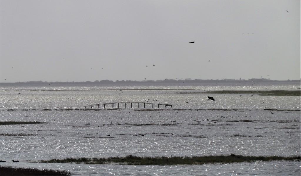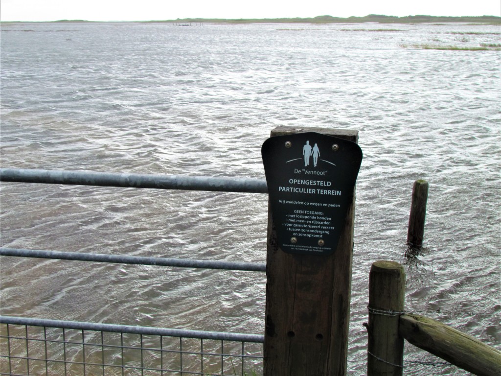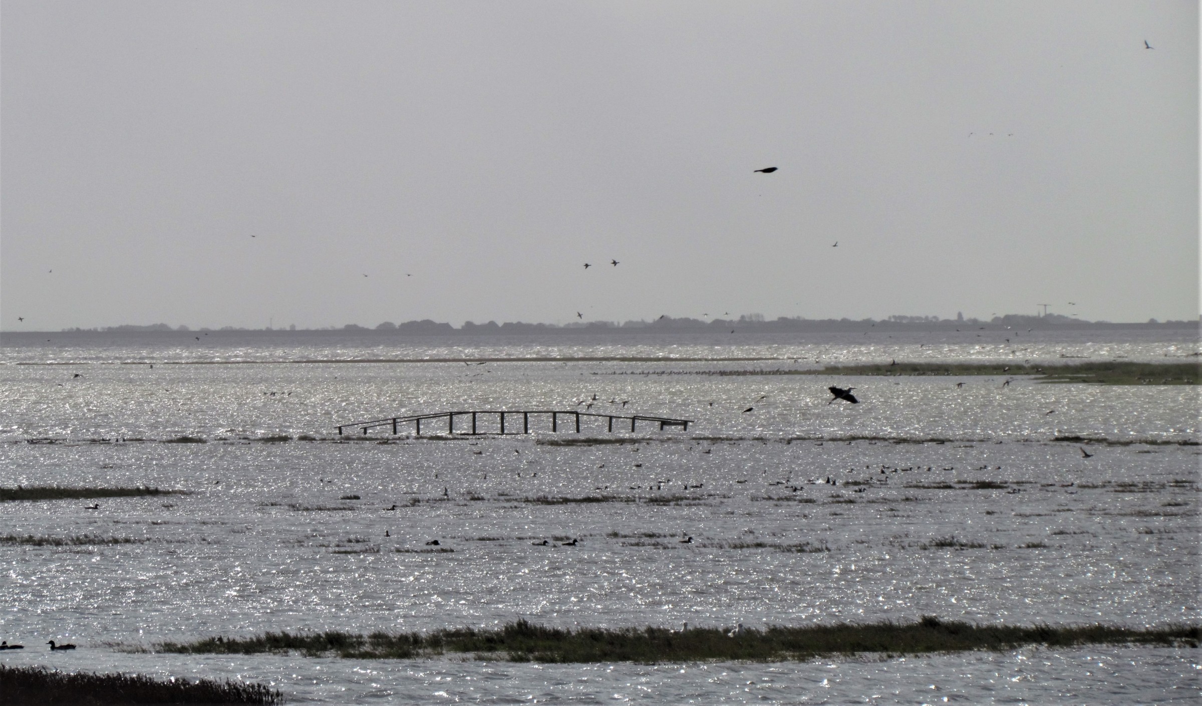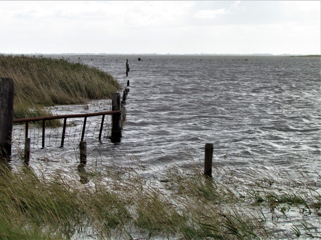 De relingen van de brug over de Oerdsloot steken nog boven het water uit, verder is het uitzicht tot over de Waddenzee met de kerktoren van Ternaard rechts.