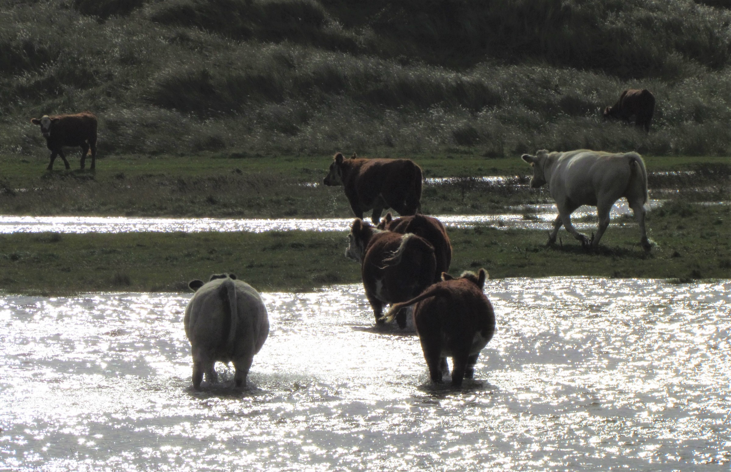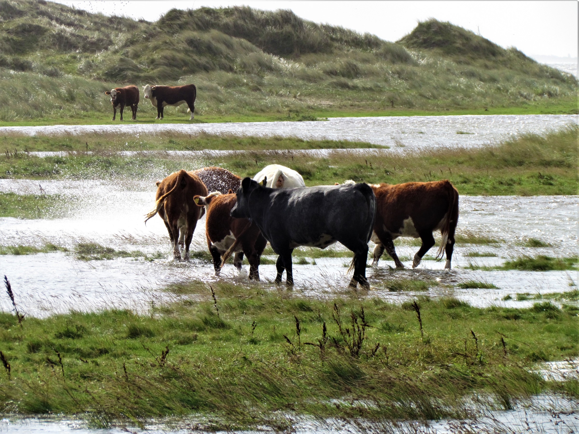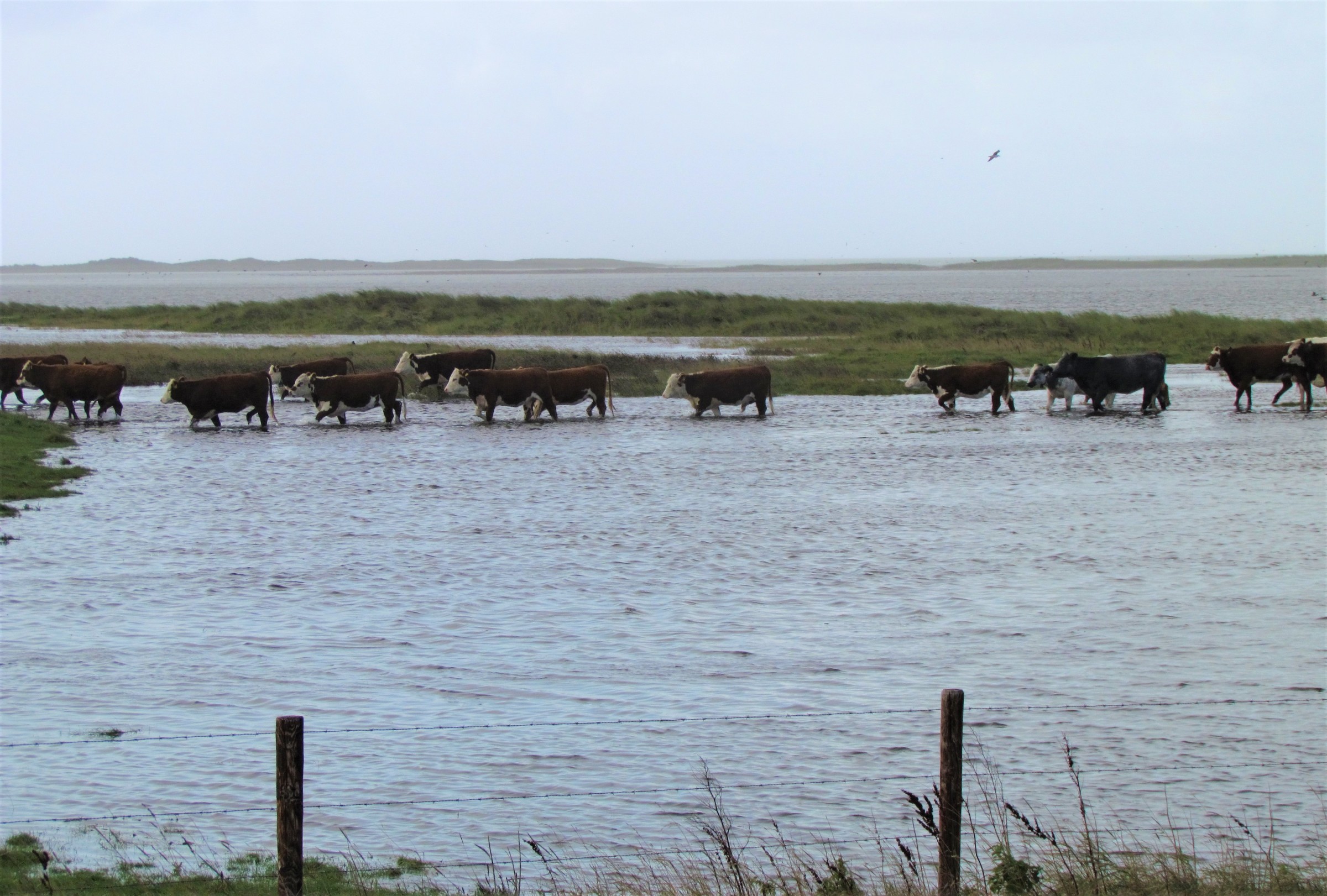 Om 11 uur valt het nog mee, het vee kan nog ongestoord weiden op de hoge stukken van de kwelder waar het uit voorzorg al naar toe is gebracht.