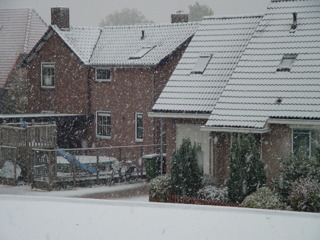 Een goed praatje! Ik kan warm weer in deze tijd van het jaar zeer wel waarderen. Kil herfstig weer zullen we de komende maanden nog genoeg krijgen en voor winterweer is het nog te vroeg. Alhoewel... de bijgaande foto kon ik op 24 oktober 2003 schieten, vanuit mijn slaapkamerraam!