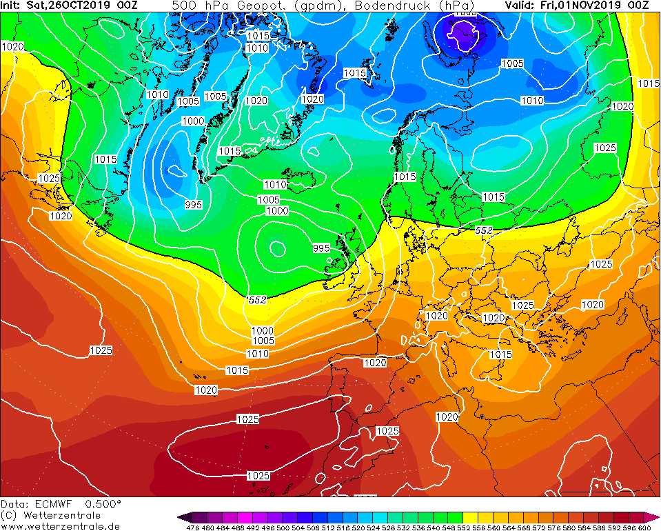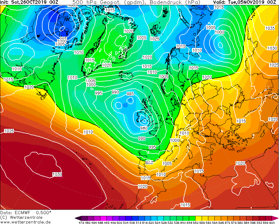 We hebben deze week toch naar modellen gekeken die voor 1e week november een vrij apart stromingspatroon lieten zien, met hogedruk bij UK en ten noordoosten, met bijbehorende frisse temperaturen.