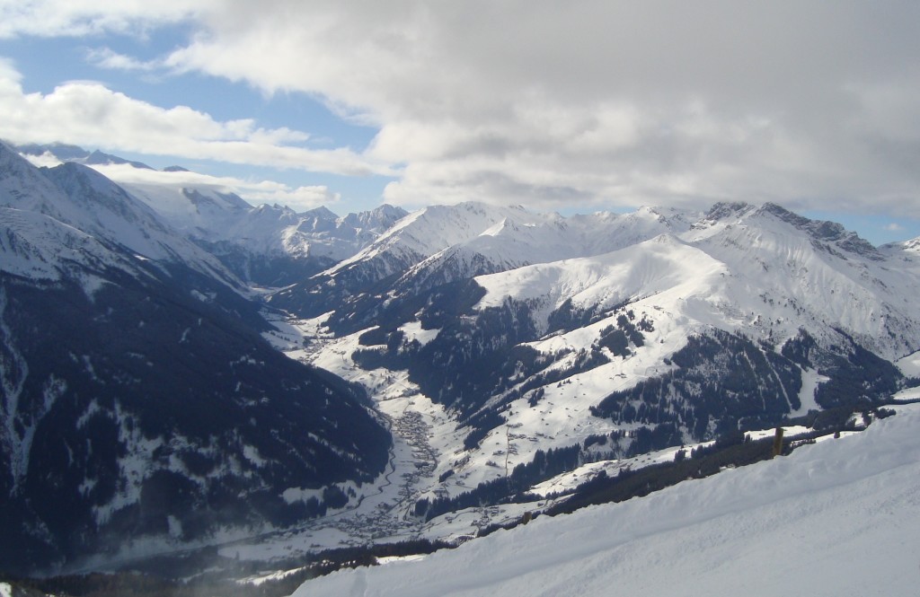 Mooi contrast tussen sneeuw en het groene dal beneden.