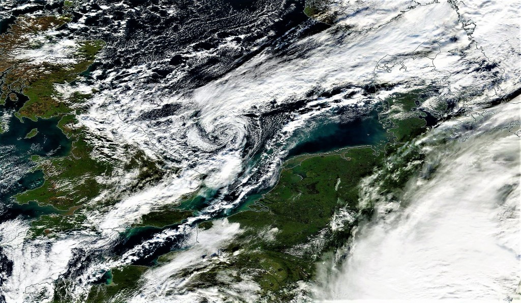 Kleine depressiekern mooi zichtbaar op satellietfoto
