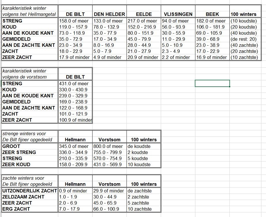 ... heb ik de volgende spreadsheet gemaakt voor de vijf hoofdstations, die wat beter aansluit bij de hedendaagse werkelijkheid. Voor De Bilt heb ik dat nog wat verder uitgewerkt met ook de vorstsommen, als ook een verdere verfijning van de (zeer) zachte en (zeer) koude winters.