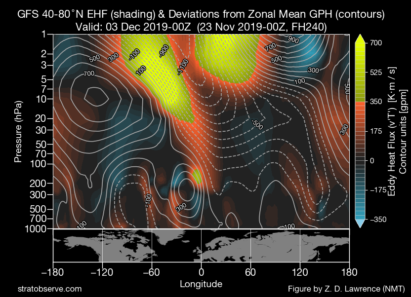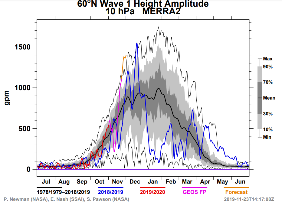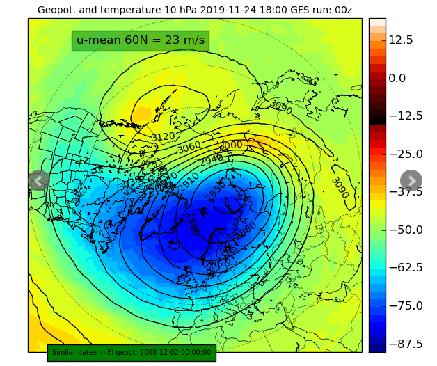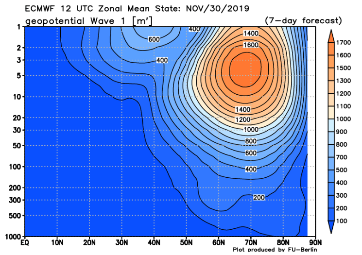 Tot slot: de opwarming van begin december is een stuk minder spectaculair in de laatste runs. Dat heeft alles te maken van de bias van het GFS voor zonaliteit. In het UGKB leidt die tot grote warmte-advectie boven Noord-Rusland en de daaraan gekoppelde stratosferische processen. In de praktijk valt dat nogal eens tegen.