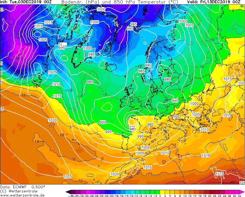 Actief ronddraaiende depressiekernen net ten zuiden van de Benelux bij een 850 hpa rond -5 en soms aanlandige aanvoer (we kunnen dan negatieve dauwpunten verwachten) kan een erg interessant weerbeeld opleveren. Bovendien worden grote delen van Europa bij zulke kaarten bedekt met een sneeuwlaag. Wat altijd een voordeel kan zijn bij een eventuele verderzetting van dit weertype.