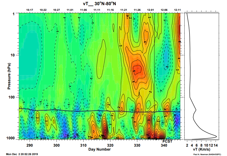 Om die te illustreren gaan we naar plaatje 4. Daarin de warmtestroom (heat flux) door windschering. Links het verleden, met duidelijk zichtbaar de opwarming (oranje) eind november. Rechts van de getrokken verticaal de verwachting. Helemaal in het uiterste bereik dient zich een volgende opwarming aan. Die wordt geïnduceerd door een warmte-impuls aan het oppervlak, dat is in de Siberische regio. Daar is de gradiënt (wind en temperatuur) maximaal, mede vanwege de reeds verplaatste vortex, maar ook vanwege het gunstige samenspel van het Siberische hoog en verhoogde depressie-activiteit bij de Aleoeten. Zo vanaf het begin van het tweede decade zou dit moeten leiden tot vernieuwde wave1 en verlenging van de druk op de stratosferische poolwervel. Deze ontwikkelingen zijn echter nog een beetje onzeker, mooi onderwerp voor een volgende update.