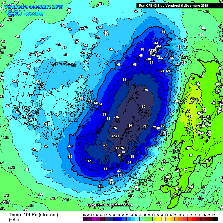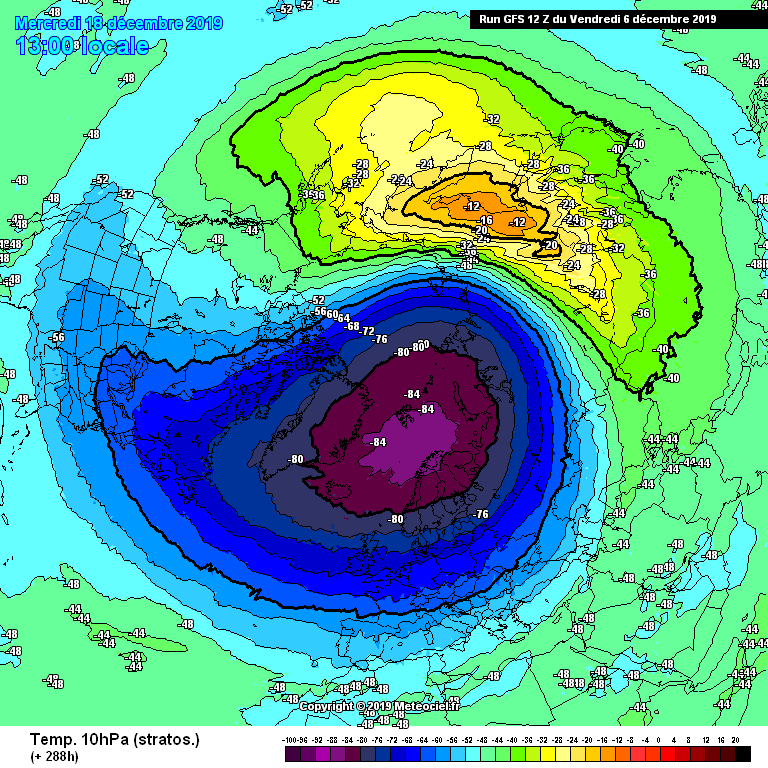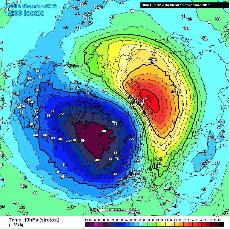 Een week of twee, drie, geleden werden er regelmatig kaartjes van de stratosfeer voor ver vooruit gepost. Laten we eens zien wat daarvan terecht is gekomen. Op de eerste kaart de GFS prognose van de stratosfeer op 10 hPa van 19 november voor +384 uur (Nicolas bedankt voor het posten