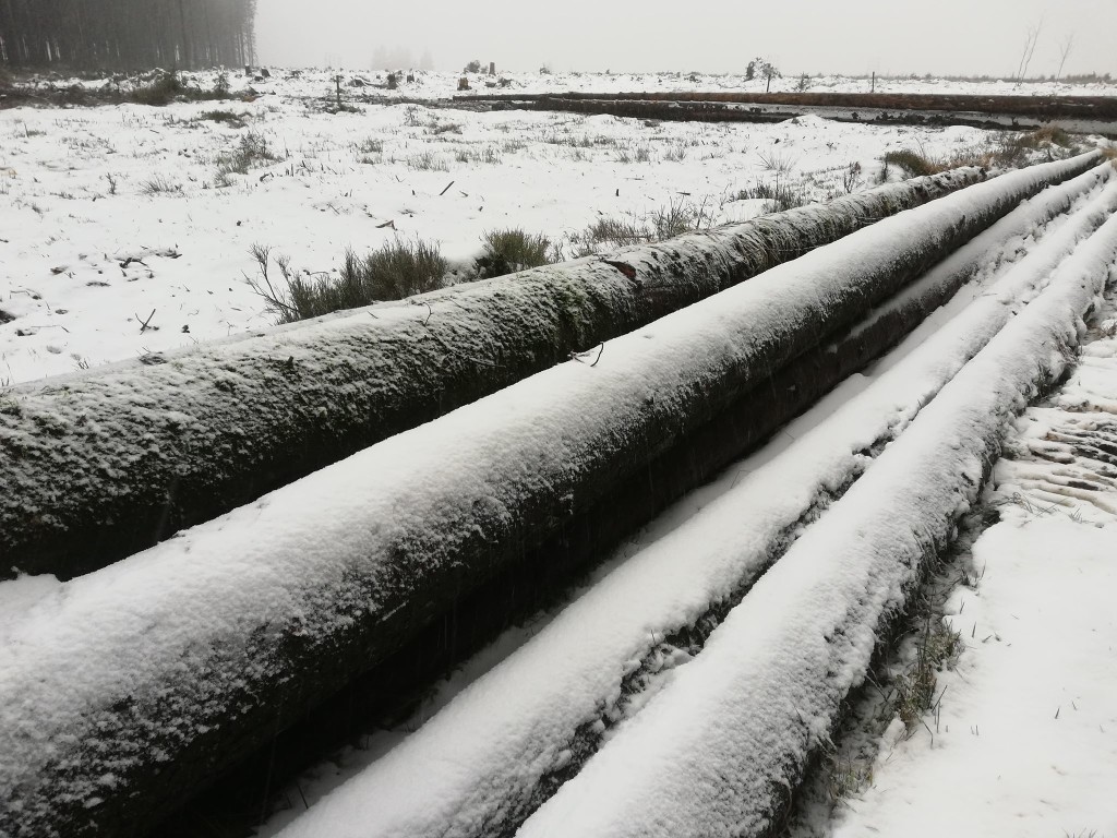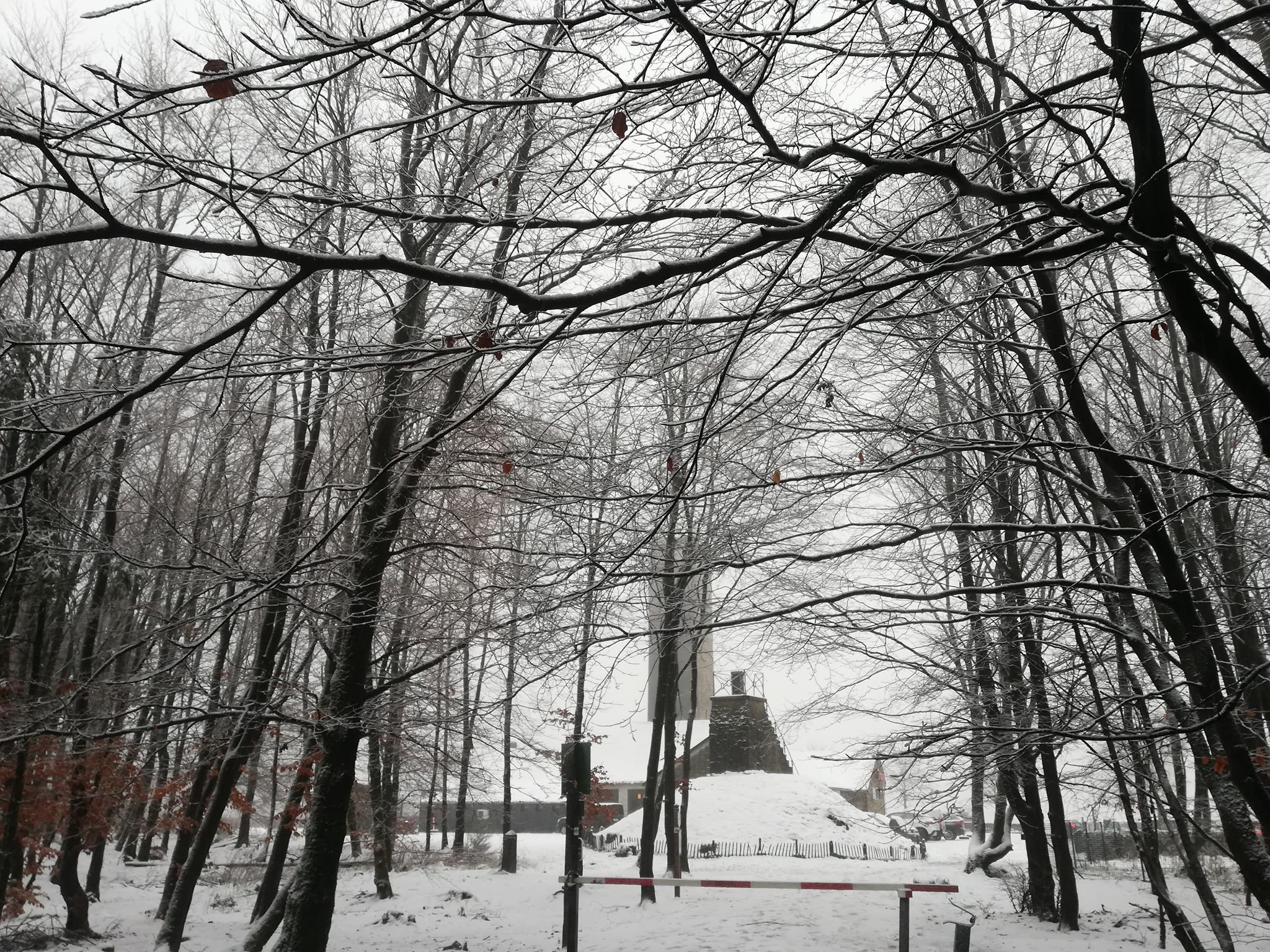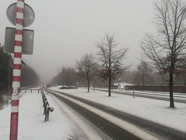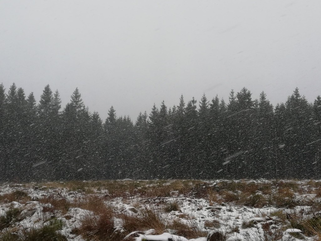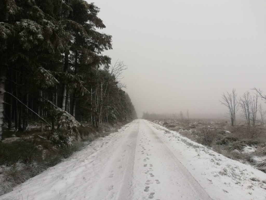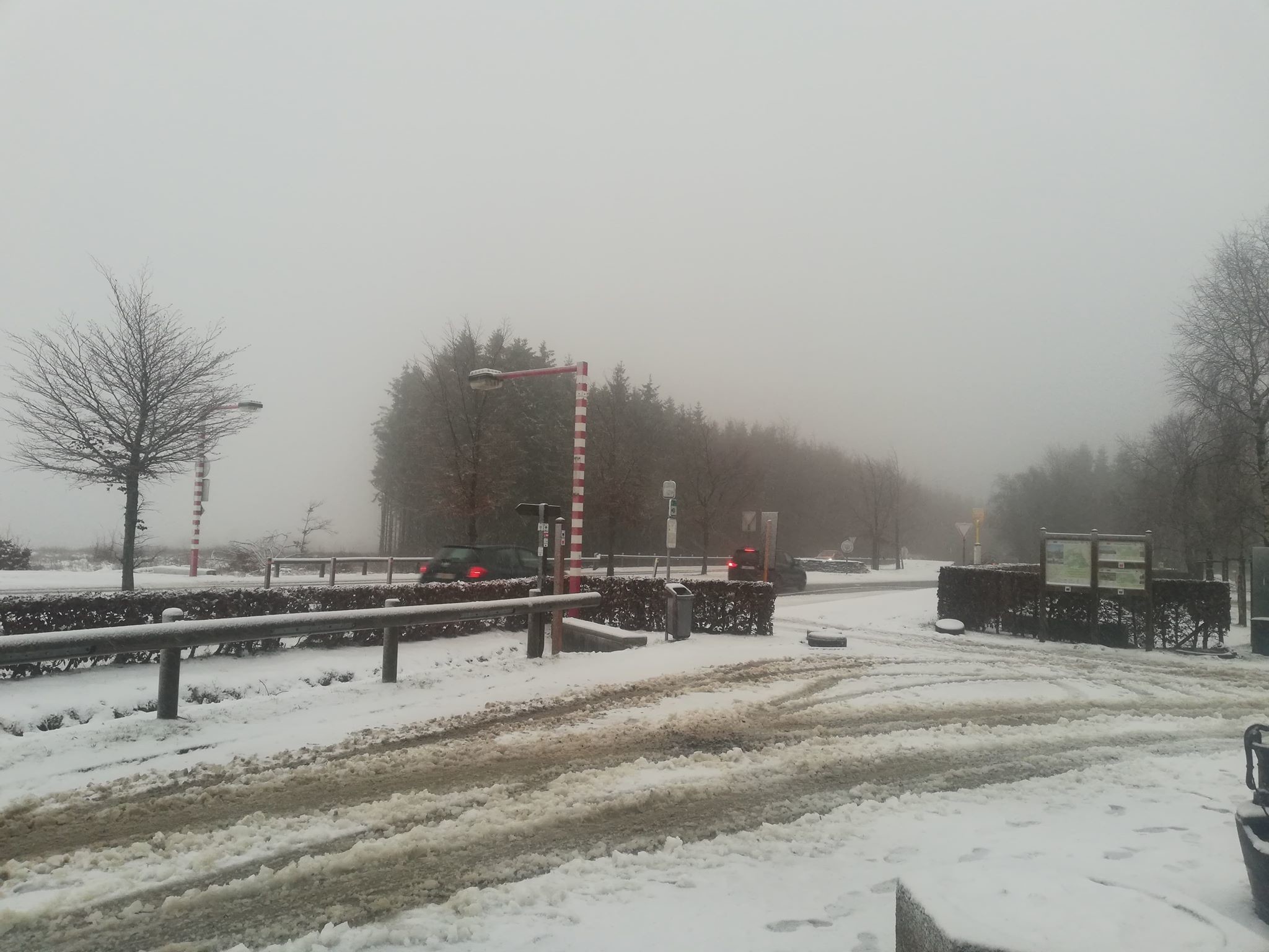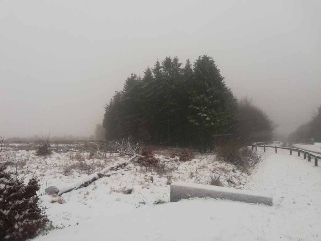 Vanaf ongeveer 550m hoogtemeters waren er sneeuwresten zichtbaar van de vorige nacht. Het was duidelijk dat er ook regen op het sneeuwdekje gevallen was. Echte natte vlokken waren er pas vanaf ongeveer 600m hoogte bij +1°C. Het was alweer pas de laatste 50/100meter dat het echt wit werd. Aangekomen op de Botrange was het +1°C en viel er natte sneeuw.