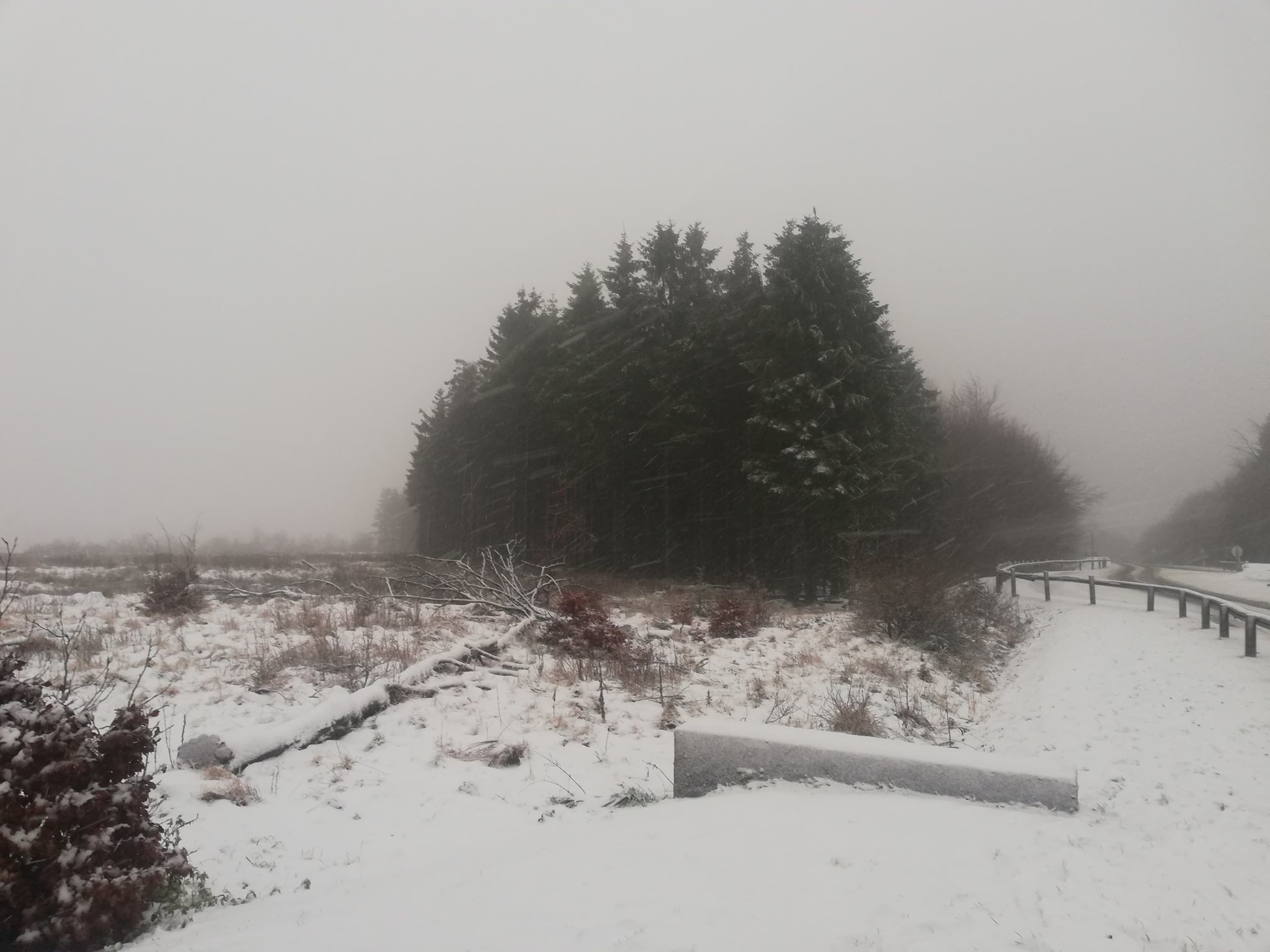 Een uurtje nadien daalde het kwik en intensiveerde de sneeuwval. Het kwik daalde snel naar 0.5°C en het landschap werd wat witter. Nadien volgde een drogere periode waardoor de nieuw gevallen sneeuw weer wat afsmolt. Omstreeks 3uur begonnen plots dikke watten uit de lucht te vallen en zakte te temperatuur tot 0.2°C. De wind draaide en kwam enorm krachtig uit de hoek. Dikke vlokken vlogen horizontaal voorbij. De sneeuw deed pijn in het aangezicht. Het landschap werd nu snel witter, en ook de natte plekken met drabsneeuw werden nu terug wit. Bomen kregen ook een laagje sneeuw maar door de harde wind bleef er niet veel liggen op de takken. Bij aankomst op de Botrange werd duidelijk dat de sneeuwgrens echt rond de 650m lag. Ook boven werd de sneeuw terug duidelijk natter en plassen werden weer zichtbaar. Een maximale dikte van +-5cm werd gemeten.