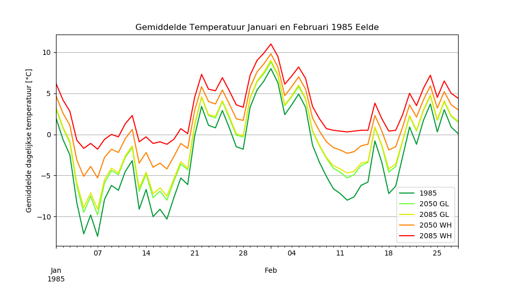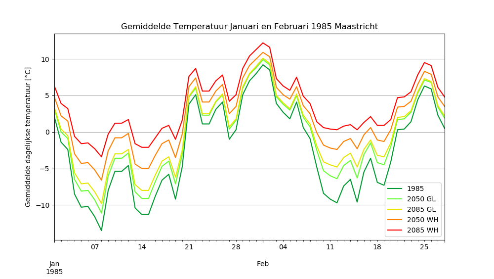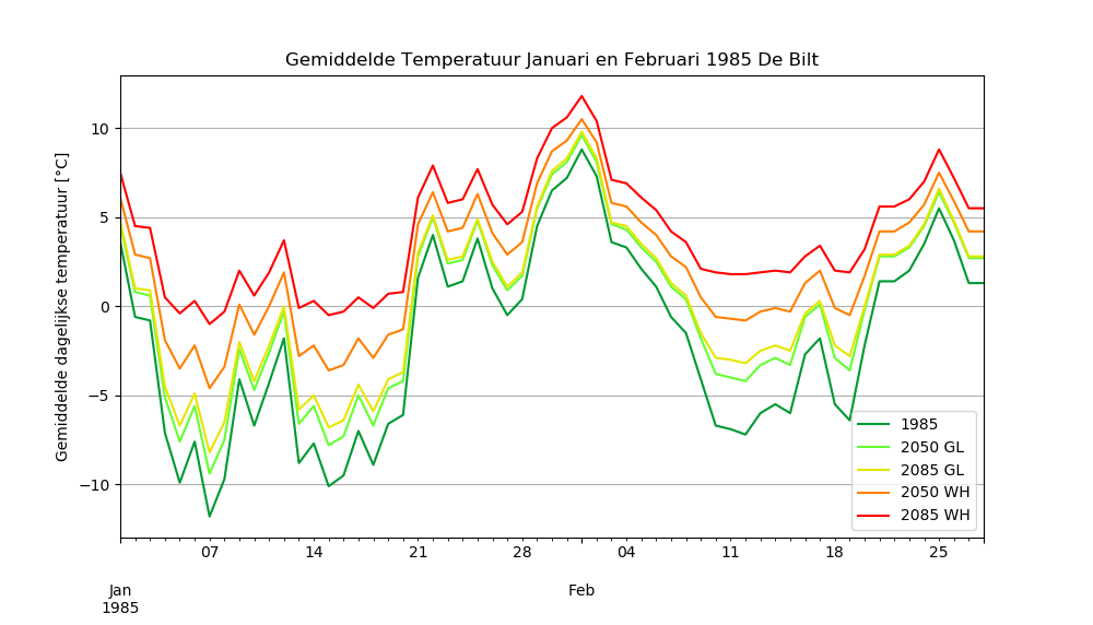 Ik heb het warmste (WH) en het koelste klimaatscenario (GL) voor 2050 en 2085 er even uitgepakt en deze tijdseries tegen elkaar uitgezet. Het WH scenario representeert een wereld waarin er geen maatregelen worden getroffen om de uitstoot terugdringen en waarin westenwinden in Nederland toe zullen nemen in de winter. Het GL scenario weergeeft een wereld waarin de uitstoot wel flink wordt teruggedrongen en waarin klimaatverandering de atmosferische circulatie niet echt verandert. Voor meer info over de klimaatscenario's zie http://www.klimaatscenarios.nl/.