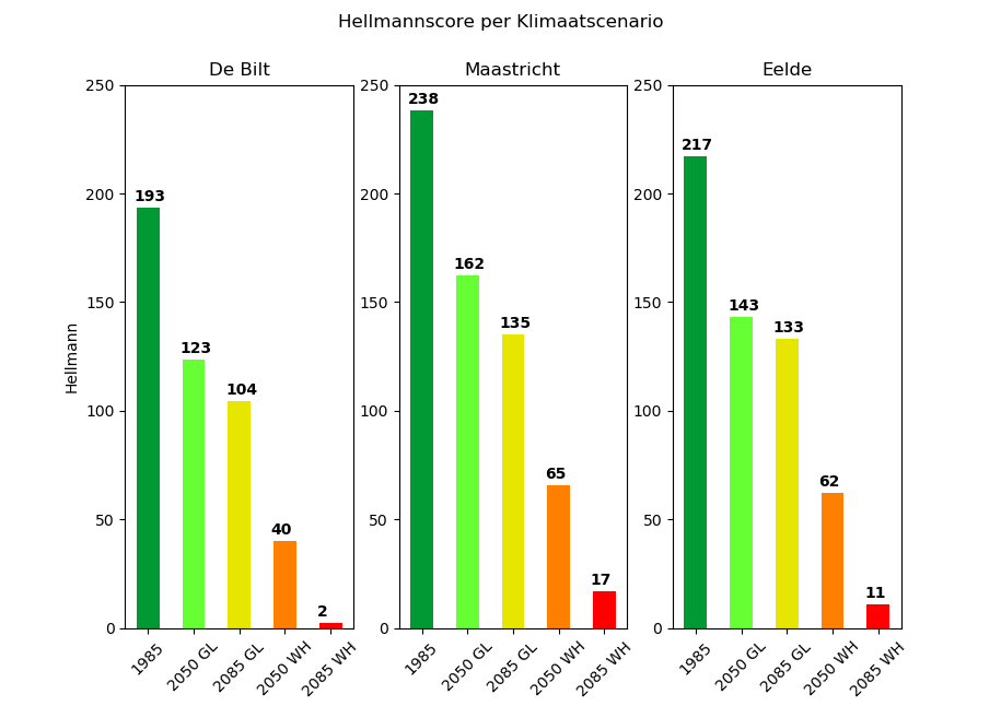 Verder heb ik als laatste nog even alle Hellmann Scores berekend voor een equivalente winter 1984/85, elke locatie en elk klimaatscenario. Wat wel duidelijk is, is dat als de uitstoot van broeikasgassen zo doorgaat zelfs een Elfstedentochtwinter, nauwelijks nog winterweer oplevert. Dat vind ik zelf best wel shockend! (Ik ben pas 22, dat ga ik wellicht nog meemaken)