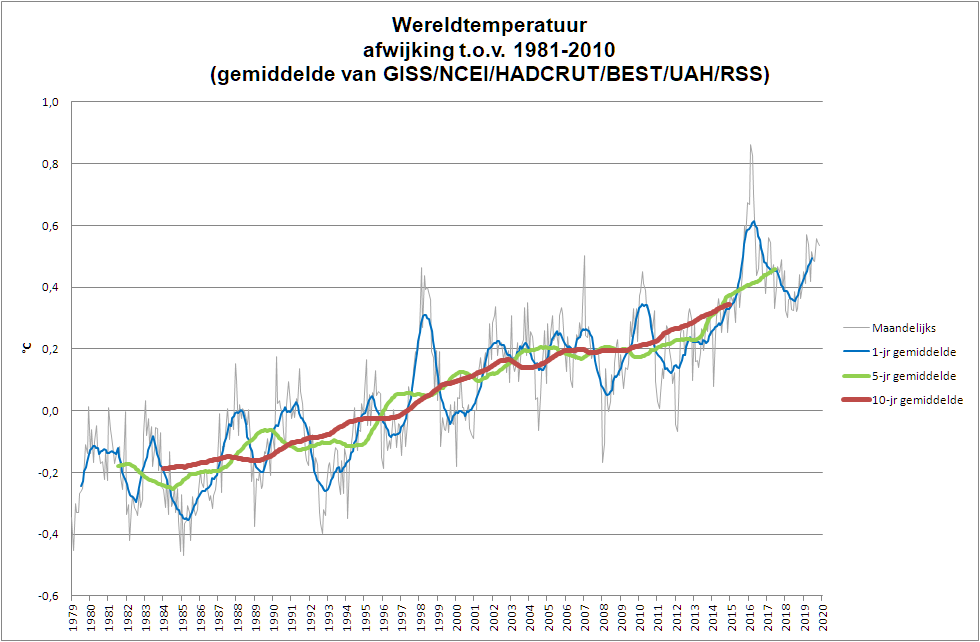 De combi van GISS/NCEI/HADCRUT/BEST/UAH/RSS had over november 2019 een afwijking van +0,53° t.o.v. de basisperiode 1981-2010; een 2e plaats sinds 1979.