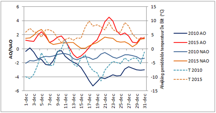 Die wordt in het volgende voorbeeld verduidelijkt. December 2010 kende een sterk negatieve AO, terwijl december 2015 een sterk positieve AO had. In het eerste geval was de atmosfeer in de poolgebieden en de Atlantische regio geblokkeerd, in het tweede bestonden er geen golvingen in de polaire jet. De temperatuur gestippeld is van De Bilt, rood is de AO in 2015, blauw de AO in 2010. De NAO is minder dik erbij geplot.