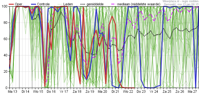 Gemiddelde is niet veranderd t.o.v. de 12Z pluim van gisteren. Mocht het 1 of meerdere nachten tot matige vorst komen (wat o.b.v. deze pluim het maximaal haalbare lijkt) en overdag onder de 5°C blijven dan wil ik best van licht winters weer spreken, maar verder is het natuurlijk wel een uitzichtloze pluim. Bij eerdere koudere periodes zag je eigenlijk altijd al wel een groeiend cluster met ijsdagen op de proppen komen, dat is in deze en andere getoonde pluimen van de afgelopen dagen bij lange na niet het geval.