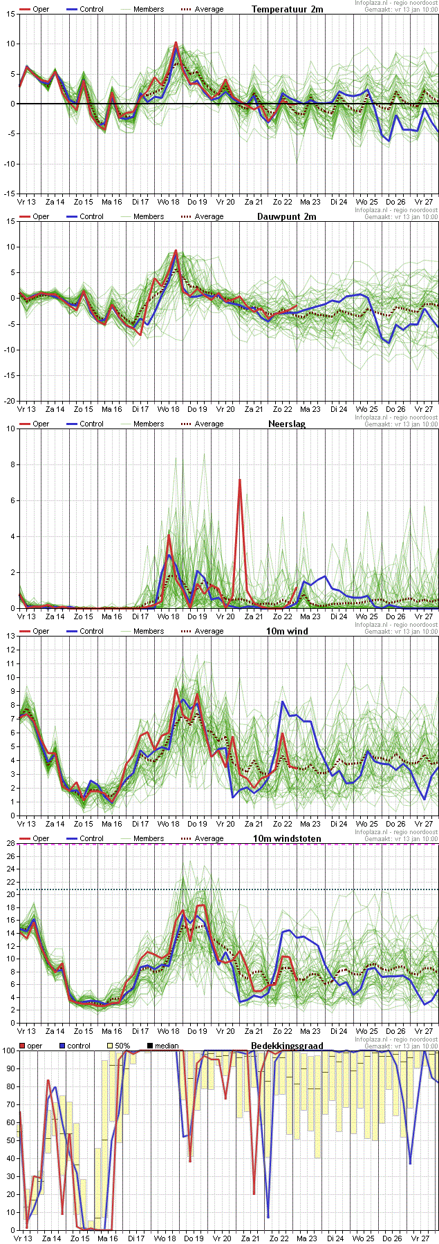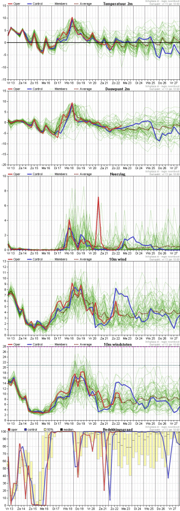 Van de 19e tot en met de 27e kwam het zelfs geen enkele keer tot vorst; een flinke tegenvaller op basis van deze pluim. De sfeer op het forum zal toen niet altijd even goed zijn geweest, schat ik in. Op de 28 viel de winter alsnog in en de maand eindigde met 2 ijsdagen. Het vervolg weten we allemaal!