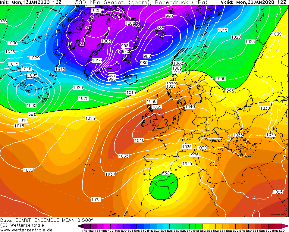 Bijgevoegd de Ens kaart van Ec12z+168 uur. Hoog exact boven Nederland, dus oper zal wat bovenin in de pluim liggen? Ik gok een pluim met vorstnachten met overdag rond +5 graden Celsius begin volgende week..