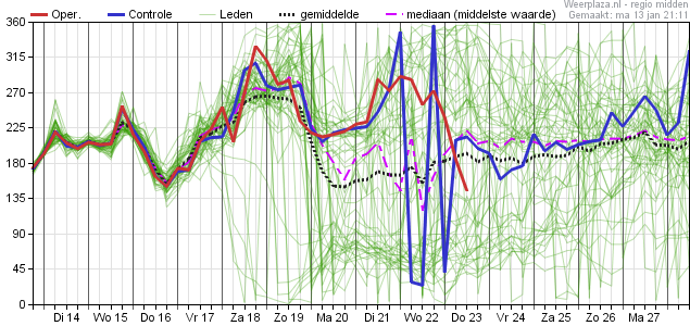 Bijgevoegd de Ens kaart van Ec12z+168 uur. Hoog exact boven Nederland, dus oper zal wat bovenin in de pluim liggen? Ik gok een pluim met vorstnachten met overdag rond +5 graden Celsius begin volgende week..