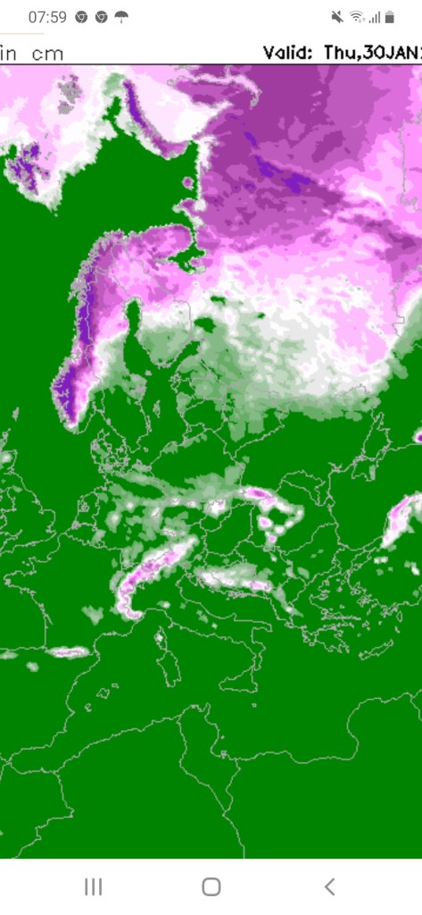 Record verdacht. Bijvoorbeeld Scandinavië.. Pas in midden Zweden een serieus sneeuwdek. Zuid Finland d slechts licht bepoederd. Ook oost Europa niet veel soeps.