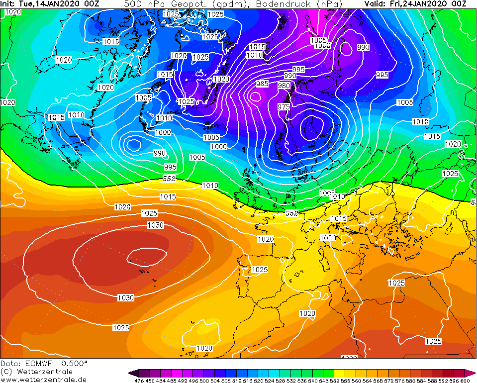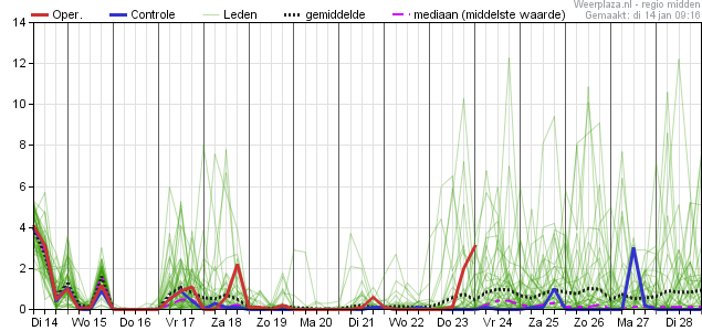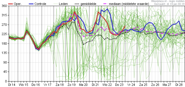 In onderstaande windrichtingenpluim goed te zien, bijna geen lijntjes meer met een oostenwind terwijl eergisteren (edit: maak daar maar "gisteren" van) nog de ruime meerderheid een oostenwind had. Verder toont de 240u kaart van de oper minder hogedrukinvloed bij ons en meer lagedrukinvloed, aan de neerslagpluim te zien is de oper daarin niet de enige berekening aangezien het gemiddelde vanaf dan ook weer van de nul af komt.