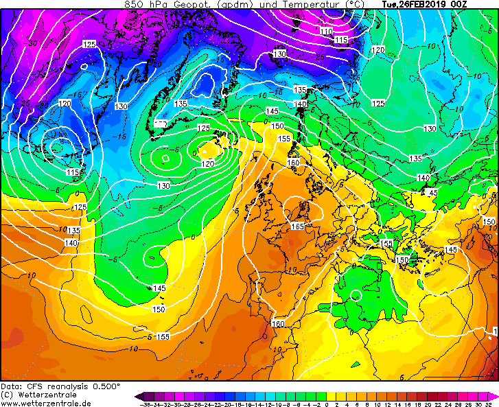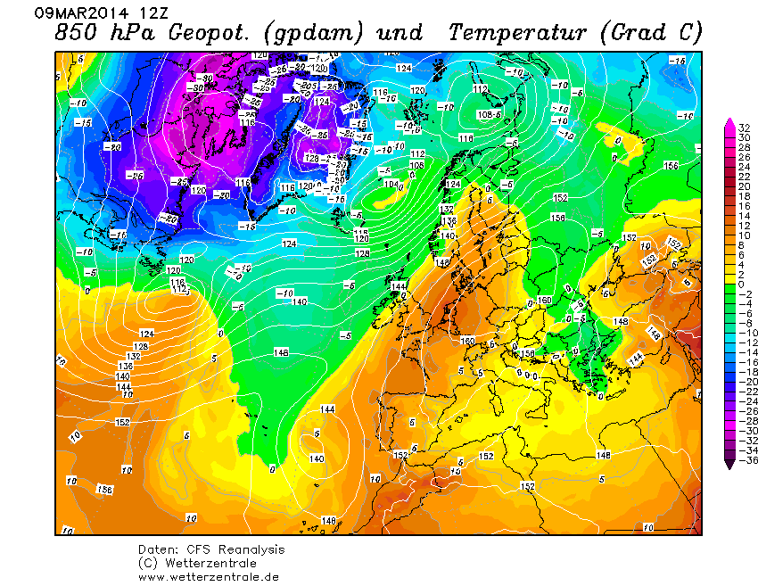 Nog geen tien graden. Ik vond zo snel twee situaties met hogere 850hPa-temperaturen, namelijk 26 februari vorig jaar (ca. 10 graden) en 9 maart 2014 (ruim 12 graden!). Als enkele weken eerder in het seizoen al hogere 850hPa-temps mogelijk zijn, dan moet dat record zeker gebroken kunnen worden.